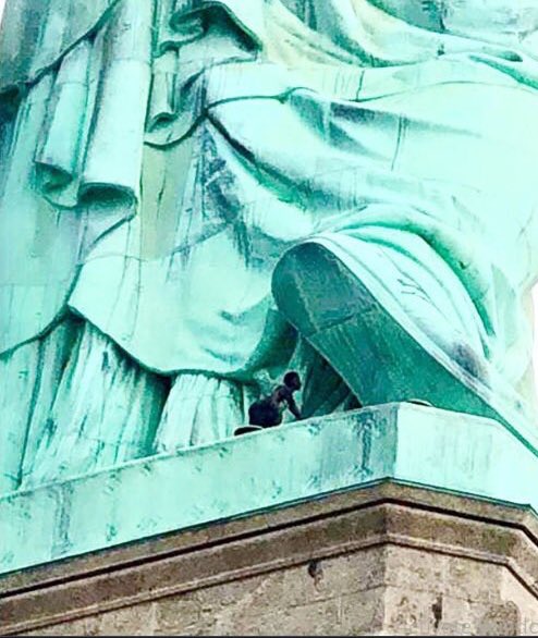 Patricia Okoumou protests U.S. treatment of families seeking asylum by climbing to base of Statue of Liberty last July 4. Photo by Abagond at wordpress.com