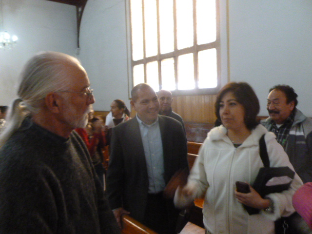 At the sanctuaary dedication Ramiro Ortiz stands behind his wife in blue blouse on left and next to son in red jacket/ En el culto de dedicación Ramiro Ortiz se paró detras de su esposa en blusa azule y al lado del hijo major en saco rojo